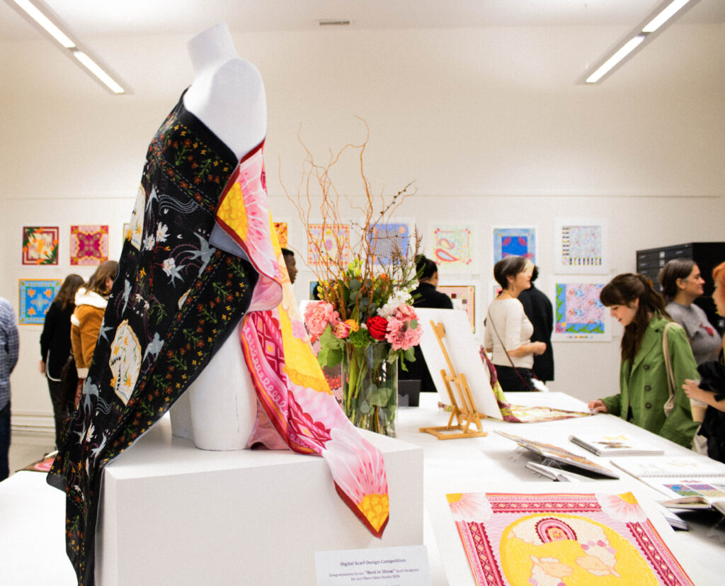 The obvious highlight of every Fibers Open Studio is the talented seniors, like Scott Groves’ elegant nature-driven surface designs, Eve Friday’s dynamic jacquard woven tapestries, and Lily McWhorter’svibrant floral interior textiles, to name a few. The open studio showcased not just the seniors’ collection, but what Fibers is at its core.